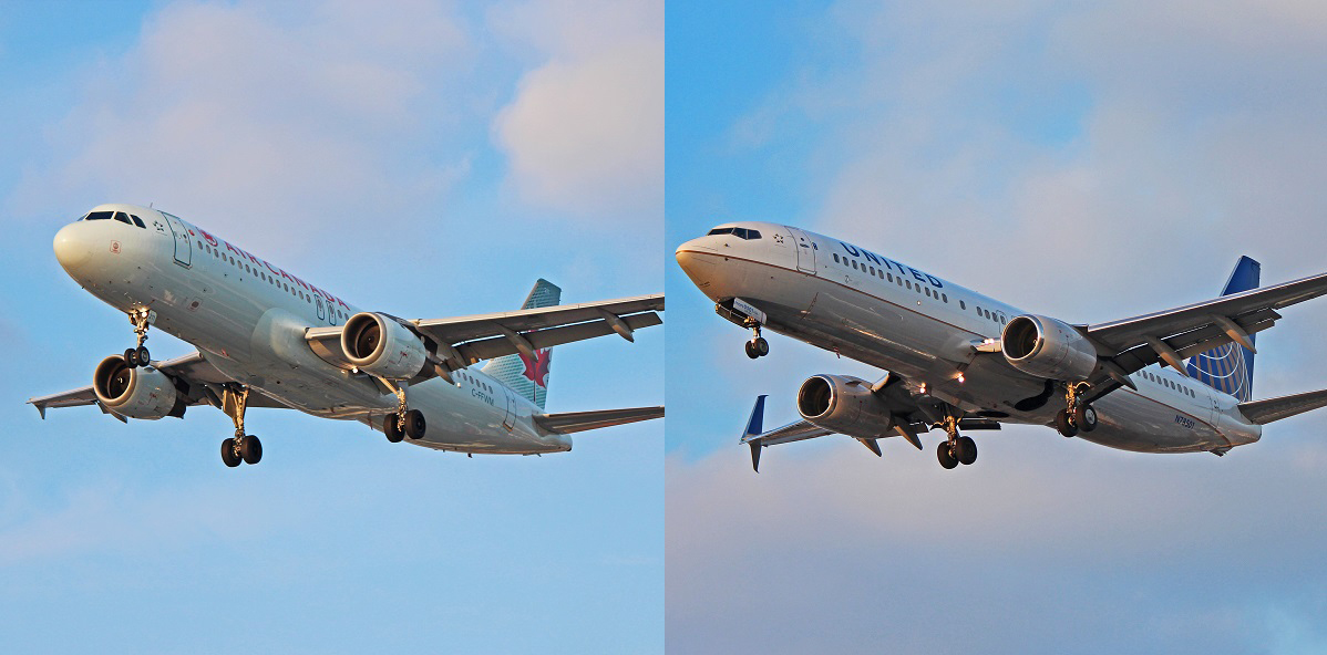 Отличить самолёты двух производителей можно по нескольким признакам. Самый заметный — форма носа: у Boeing он заострённый, угловатый, у Airbus — округлый, плавный. Хвостовое оперение тоже различается: у Boeing переход от фюзеляжа к килю имеет характерный излом, у Airbus — плавный, без изгиба. Двигатели на Boeing 737 снизу слегка приплюснуты из-за низкой посадки шасси, а на A320 — круглые в сечении. Ещё одно отличие — форма иллюминаторов: у Boeing они овальные с заострёнными углами, у Airbus — прямоугольные со скруглением.