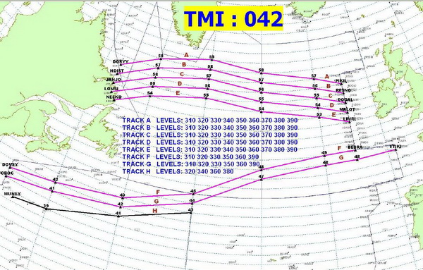 Информация о треках рассылается в виде сообщений NAT Track Message определённого формата, который включает обозначение трека, маршрут и доступные эшелоны полёта. Например, типичное сообщение выглядит так: трек A от точки ERAKA через координаты 60/20, 62/30, 63/40 до точки MAXAR, с доступными эшелонами для западного направления FL310, FL320, FL330, FL350, FL360, FL370. Экипажи получают эту информацию через бортовые системы связи или наземные службы диспетчинга. Выбор конкретного трека зависит от пункта отправления и назначения, желаемого эшелона, типа самолёта и предпочтений авиакомпании.