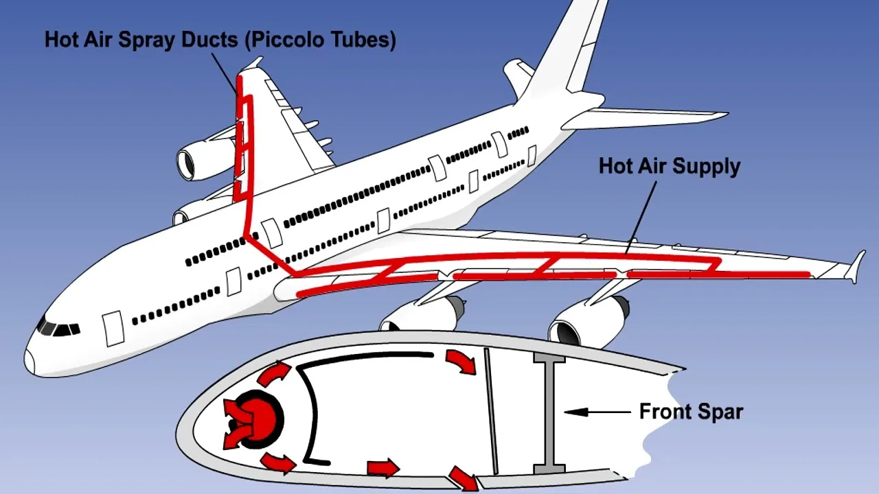 Пассажирский лайнер на крейсерской высоте 10-12 километров летит через облака при температуре −30…−50 °C. Капли воды в облаках переохлаждены — они остаются жидкими даже при минусовой температуре, но при ударе о холодную поверхность мгновенно замерзают. Тонкий слой льда на передней кромке крыла меняет его профиль: подъёмная сила падает, сопротивление растёт, и самолёт может потерять управляемость. Чтобы этого не произошло, система противообледенения (anti-icing system) заранее нагревает поверхности, на которых лёд мог бы образоваться — переднюю кромку крыла, воздухозаборники двигателей и датчики скорости.